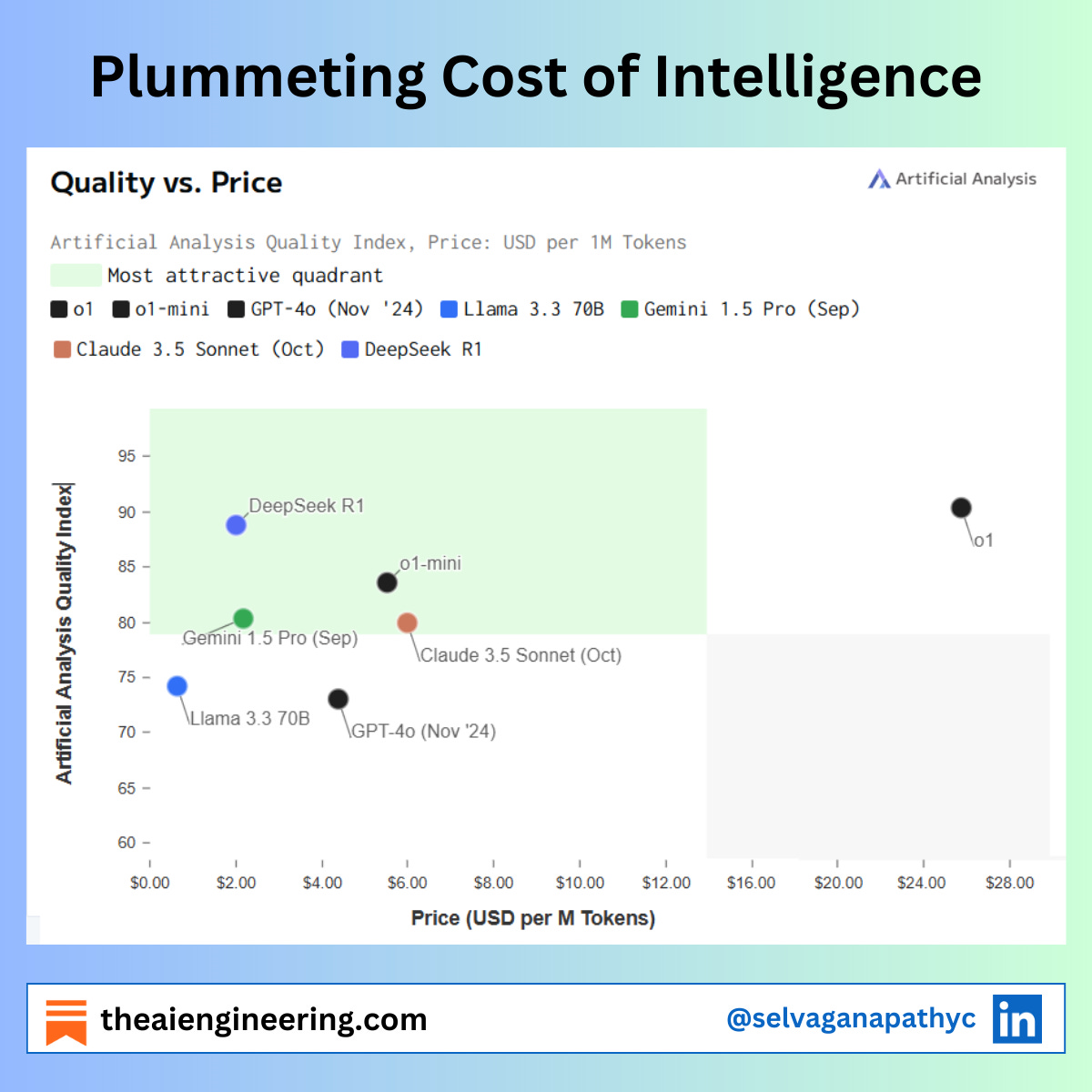 Looking at the latest AI model price-quality analysis, DeepSeek's positioning ($2/1M tokens with 89% quality score vs OpenAI o1 $26/1M with 90% quality score) isn't just impressiveโit's a powerful market signal. Here's why this excites me about the AI application space: