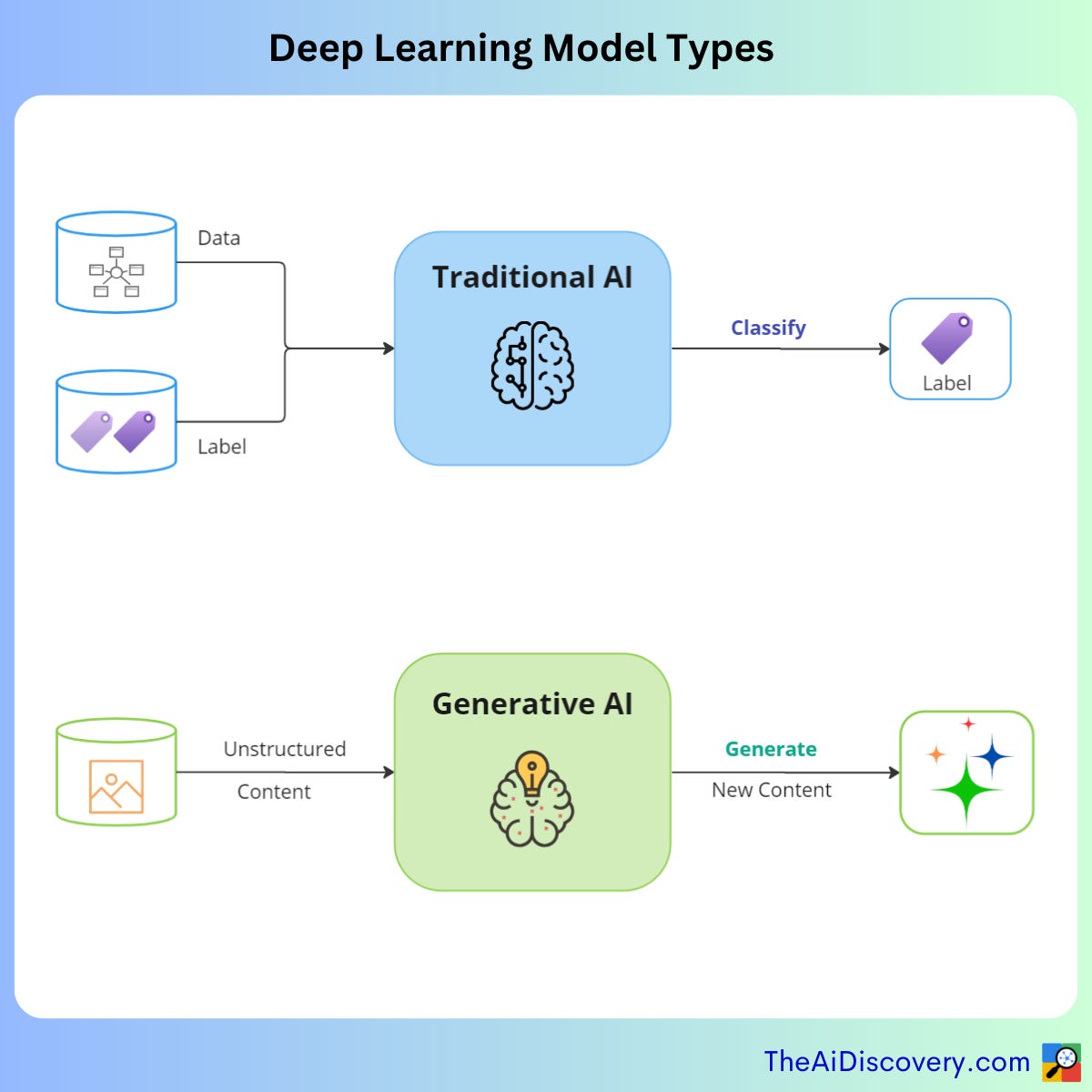 Traditional AI relies on discriminative techniques, focusing on classifying data into predefined categories based on learned distinctions from labelled datasets. For example, in spam detection, these models learn to differentiate between "spam" and "not spam" emails, aiming for accurate classification of new data.