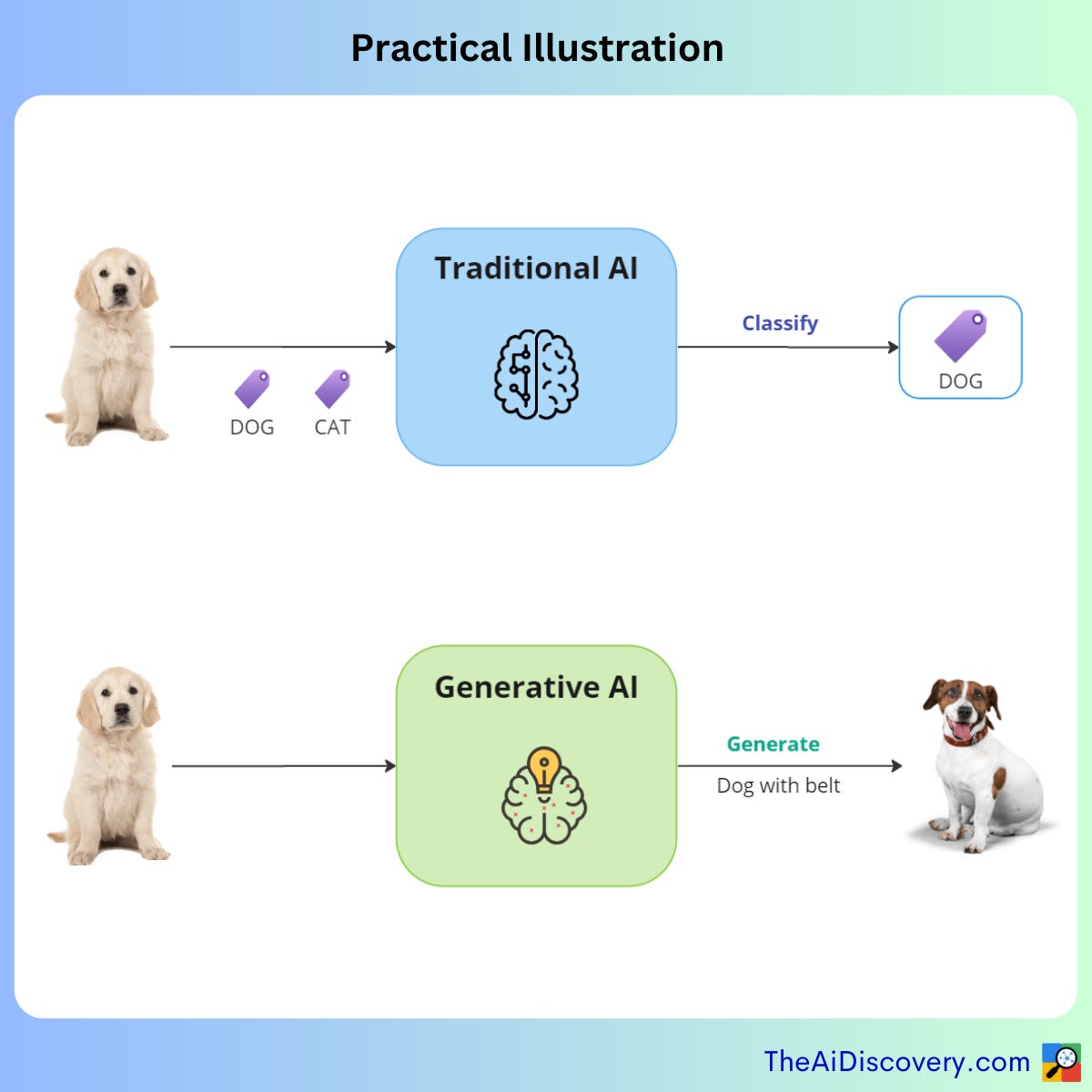 Generative AI takes a step further by generating new images after analyzing the characteristics of cats and dogs. For instance, it can create an entirely new image of a dog with a belt, a product of the model's understanding of the data's underlying patterns, not just differentiation between classes.